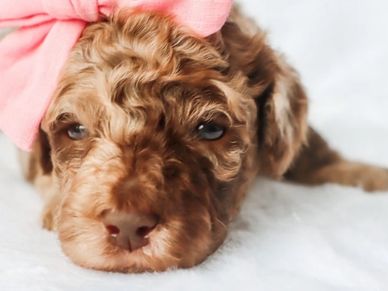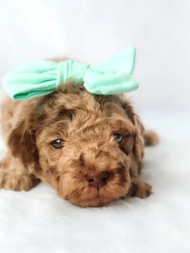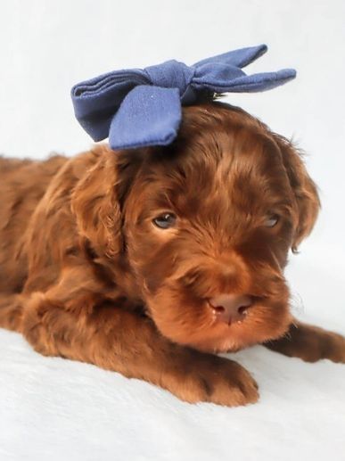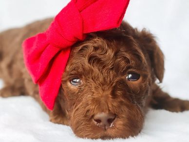 RESERVED for Ashly & Family. Duchess is a beautiful chocolate brown mini Goldendoodle from Talulah x Chuck’s Mini multi-gen litter. We expect her to weigh between 25-30 pounds. Reach out today to see if this Goldendoodle puppy would be a good fit for your family! Duchess is expected to go home around Christmas! As a non-shedding and hypoallergenic puppy, she’s perfect for those looking for allergy friendly puppies.